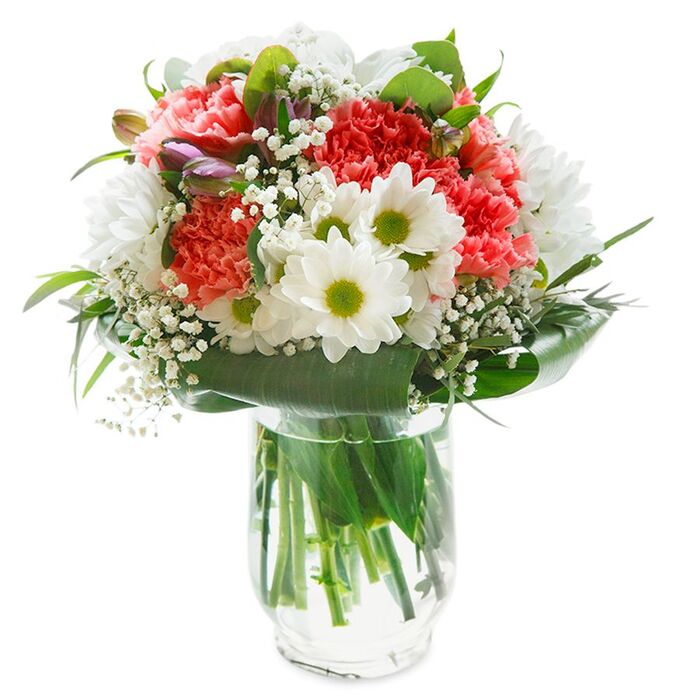Like a breath of fresh air from the riverbanks of Shadwell, this radiant bouquet blooms in a crisp white gift bag, perfectly positioned for a joyful surprise along Cable Street or just around the corner from your favourite local café. Soft, coral carnations mingle with hints of peach and vibrant red, their petals plush and slightly fragrant, holding the memory of summer's warmth. Snowy white daisies beam with lively, greenish-yellow hearts, providing a touch of innocence and delight. Airy clusters of baby's breath bring a gentle charm, swirling between the more vivid blossoms. On one side, tiny, purple-tinged buds peek curiously from the arrangement, adding a promise of what's still to come. Glossy, deep green leaves cradle the bouquet, fanning out to frame each flower with expert precision. Light pours gently over the entire display, highlighting textures and colours against the pure white background. With every petal and ribbon handle thoughtfully arranged by a skilled Shadwell florist, this bouquet feels like a true celebration of local artistry-perfect for marking an anniversary, sending birthday wishes, or simply bringing a moment of happiness to someone you cherish in E1. This bouquet is a tribute to Shadwell's vibrant spirit, composed with a keen eye for freshness, comfort, and artistry. Crisp white daisies with sun-bright lime centres stand tall among a textured gathering of coral-pink carnations, their ruffled petals conjuring images of spring gardens by St George's Park. Wispy white baby's breath adorns the bouquet with a touch of lightness, resembling tiny stars scattered across a dusk-lit sky, while eucalyptus leaves and deep green sprigs provide structure and a cool, subtle aroma. Nestled here and there, blush-tinged alstroemeria buds peer out, hinting at the joy of blooms to come. Each flower and leaf is arranged to maximise both harmony and fullness, reflecting Shadwell's character of resilience and celebration. Perfect for gifting on a significant occasion or conveying gentle encouragement, this arrangement promises to bring a wave of joy to living rooms or workspaces along Cable Street, filling them with light, scent, and heartfelt warmth. This bouquet is a radiant salute to Shadwell's lively character-cheerful, bright, and created with effortless finesse. At its core, coral-pink carnations unfurl in lush, densely petaled clusters, their lively texture mirrored in the gentle movement of the arrangement, like the morning breeze along Cable Street. Ringing them, white daisies and chrysanthemums bring notes of innocence and joy, their crisp petals and green-yellow eyes glowing with freshness. Delicate tendrils of baby's breath weave gently through the bouquet, creating lightness and dimension. From the left, a handful of magenta alstroemeria buds remain tightly closed, promising further bursts of colour and interest as days pass. Luxuriant deep green leaves-both broad and slender-encircle the stems, lending structure and a feeling of abundance, while the clear water in the glass vase glistens with freshness. The entirety is set against a flawless white background, allowing every colour and blossom to remain the sole focus. The palette, the craft, and the local touch from Shadwell florists come together in this design-an arrangement perfect for birthdays, tokens of gratitude, or simply sending a bit of uplifting spirit to a beloved home in E1.